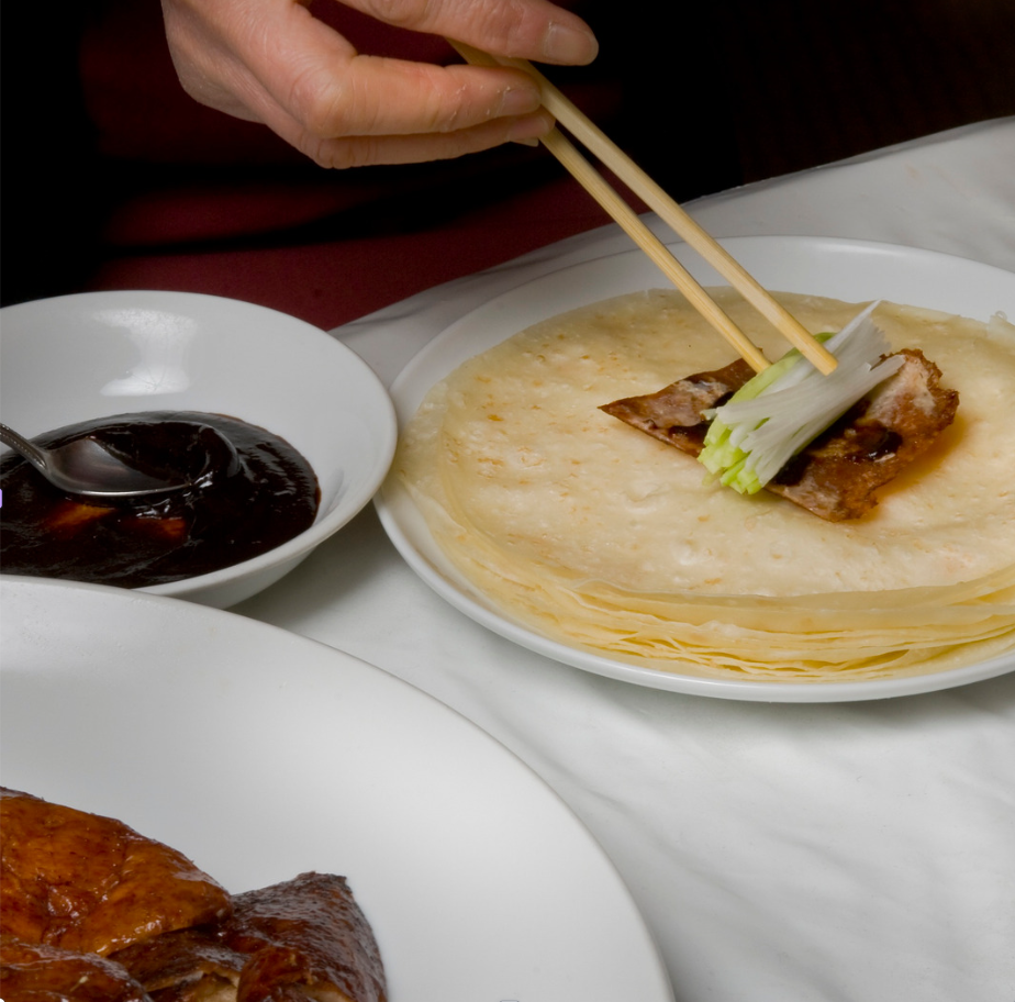Voor 2 personen. Een interactief gerecht waarbij u zelf malse eend met knapperig groentjes rolt in flinterdunne, gestoomde flensjes.
