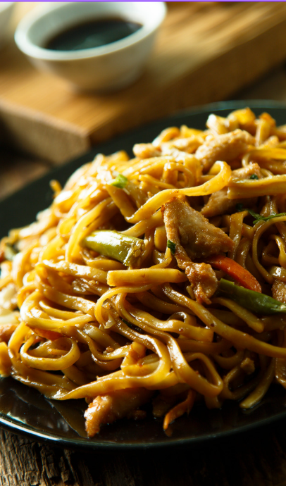 Vederlichte rijstvermicelli, à la minute gewokt. Een delicate mix van knapperige groenten en prei.