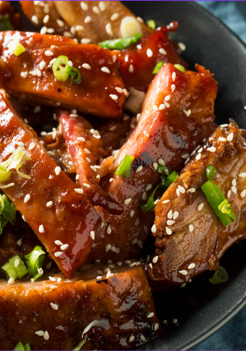 Mals gegaarde spareribs, royaal gelakt met een glanzende en licht pittige zoete chilisaus voor de perfecte balans tussen zoet en vurig.